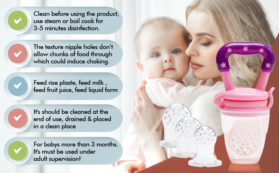 *Suzeta este ușor de utilizat. Tot ce trebuie să faci e să pui bucăți mici de fructe/legume/alimente în tetină, te asiguri că ai închis bine siguranța și să îl lasi pe bebe să se bucure de noua și favorita lui jucărie. Astfel îl poți surprinde pe cel mic cu o varietate diversă de gusturi de legume/fructe și alimente in funcție de vârstă.